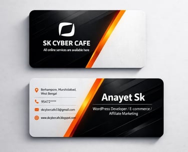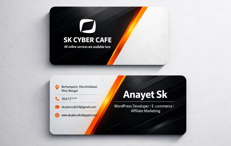 A modern, minimal and professional double-sided business card design with rounded corners, placed on a clean light grey background with soft shadows. The design uses a premium black, white, and orange gradient color scheme. Front Side (Top Card): Left side features a black glossy background with diagonal dark stripes and subtle reflections. In the center-left, a modern abstract geometric logo (rounded square shape with inner curved line) in white. Below the logo, bold uppercase text: "SK CYBER CAFE" and smaller text underneath: "All online services are available here" Font is clean, sans-serif, and modern. Right side of the card is mostly white/light grey with soft diagonal stripe texture. A sharp diagonal orange gradient stripe (yellow to deep orange) cuts across the card from top center toward bottom right, separating black and white areas. Back Side (Bottom Card): Right side has a black glossy background with diagonal reflections. Large bold white text: "Anayet Sk" Below it smaller text: "WordPress Devoloper/E-commerce/Affiliate Marketing" A thin white divider line under the title. Left side is light grey/white with subtle diagonal texture. Contact details aligned neatly: "Berhampore, Murshidabad, West Bengal" "954723****" "skcybercafe33@gmail.com" "www.skcybercafe.blogspot.com" On the right side (overlapping the orange diagonal stripe), vertically aligned small icons in orange/black: location pin, phone, email, cursor/website icon. A bold diagonal orange gradient stripe runs from top left to bottom center, separating light and dark areas, creating a dynamic modern look. Style & Quality: Ultra clean layout, high contrast, soft shadows, glossy reflections, premium corporate branding style, minimal typography, print-ready, 4K resolution, ultra HD, realistic mockup presentation.