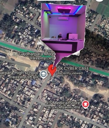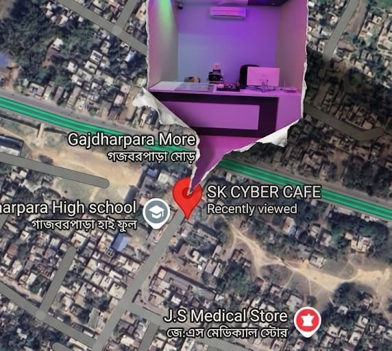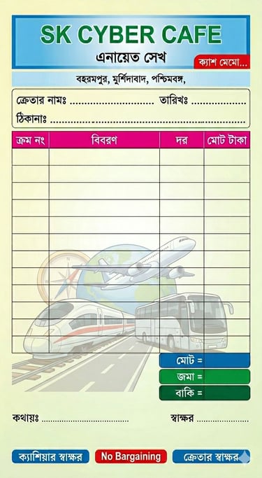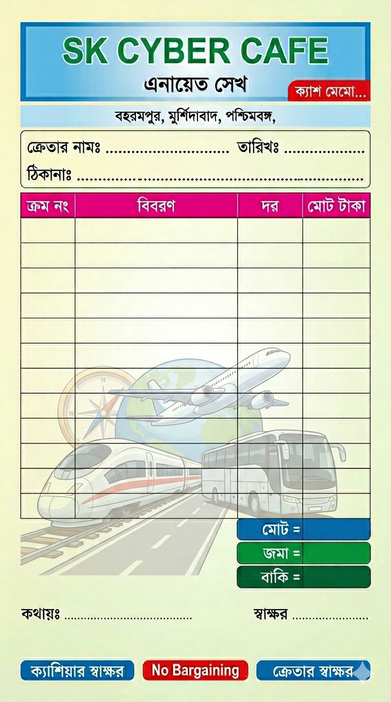 A clean and professional Bangla Cyber cafe shop invoice/bill design, portrait layout, print-ready format. Background features a soft light cream to pale green gradient.Top header section has a blue rectangular banner with a subtle gradient. Inside the header, bold green Bangla text:"SK CYBER CAFE"Below it, smaller English text in black:"এনায়েত সেখ"On the right side of the header, a small red label box with white Bangla text:"ক্যাশ মেমো..."Below the header, a thin section with address details in Bangla (small font), aligned center.বহরমপুর, মুর্শিদাবাদ, পশ্চিমবঙ্গ Next row contains input fields with dotted lines:"ক্রেতার নামঃ ................. তারিখঃ .................ঠিকানাঃ ...................................................."Main body contains a large table with borders:Columns headers in a pink/magenta row:"ক্রম নং | বিবরণ | দর | মোট টাকা"The table body has multiple empty rows with light borders for writing items.On the right bottom side of the table, small summary boxes stacked vertically:– "মোট =" (blue box)– "জমা =" (green box)– "বাকি =" (dark green box)Left side of the table background has a faint watermark illustration of a Train, bus and flight, low opacity.Bottom section includes:Left side: "কথায়ঃ ........................................"Right side: "স্বাক্ষর ........................."At the very bottom, two colored labels:Left (blue): "ক্যাশিয়ার স্বাক্ষর"Center (red): "No Bargaining"Right (blue): "ক্রেতার স্বাক্ষর"Color theme: green, cream, red, magenta, blue accentsStyle: minimal, business invoice design, clean and structuredTypography: clear Bangla print fontLighting: flat print style, no shadows